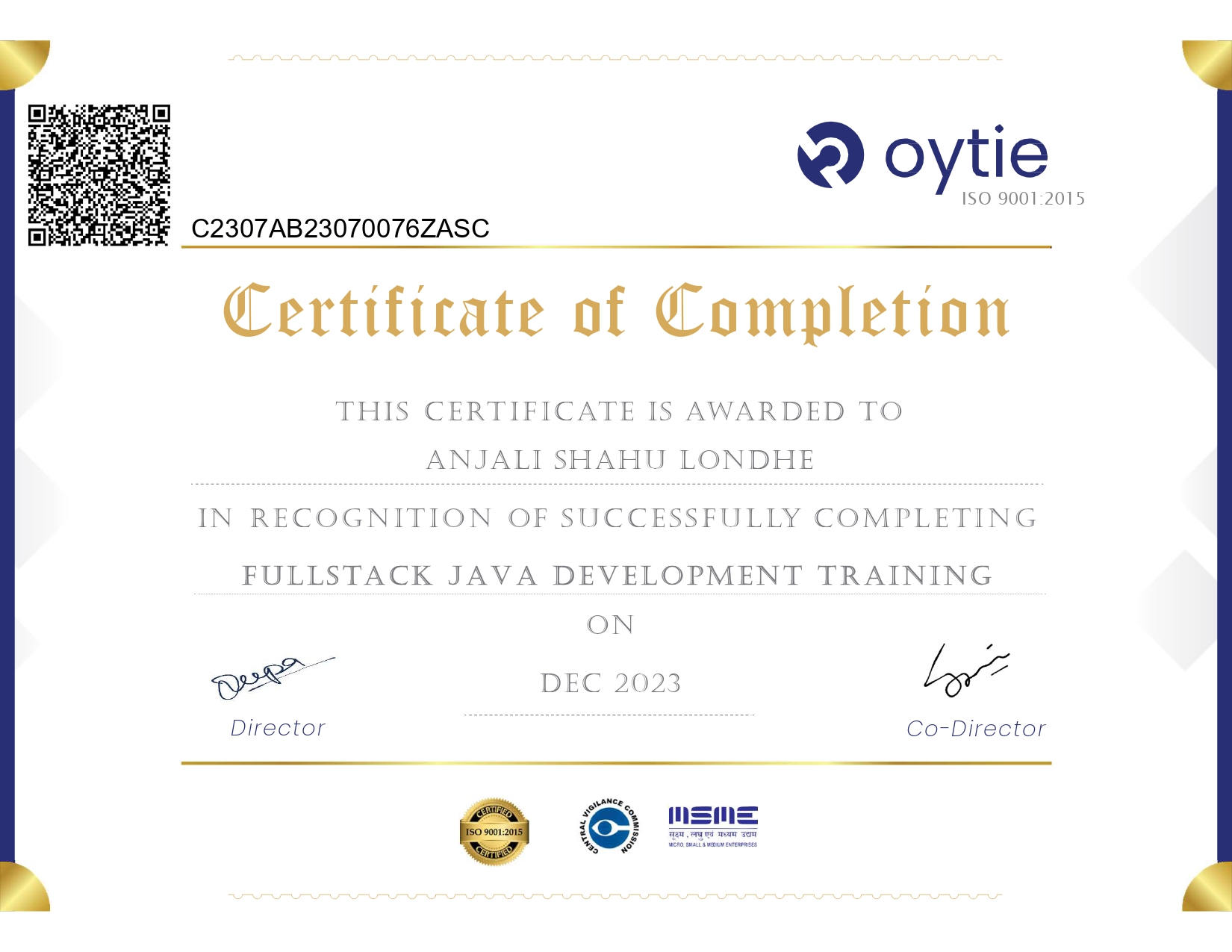 I have completed a 6-month course at Oytie Pvt.Ltd in full-stack development in Java. I have core knowledge about front-end technologies, databases, and back-end technologies. I have done poster presentation on DevOps also at the time of course. I have performed so many activities in a six months of course duration. I have projects using front-end and back-end technologies.