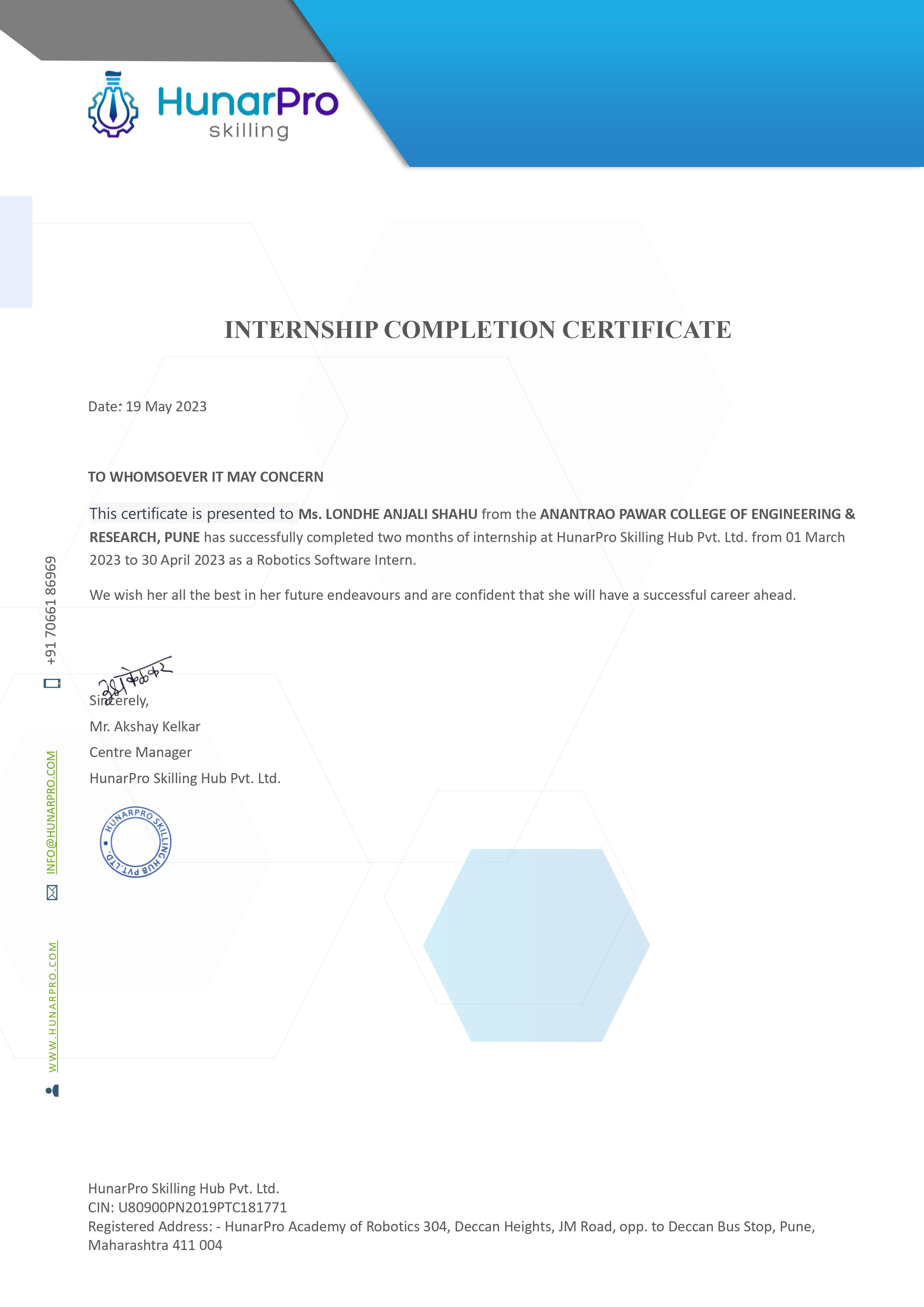 I have completed 2 months of internship in Robotics as a robotics intern. I gain the knowledge of desinging the mobile robots. It is the product based company. I have learn basic python which widely used for designing robots. The C++ and pyhton languages a mostly used for designing robots.